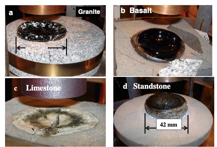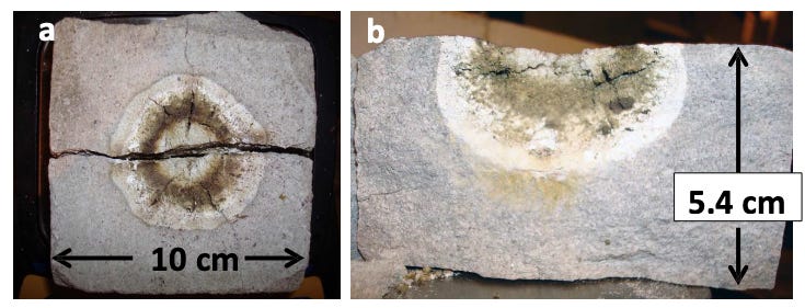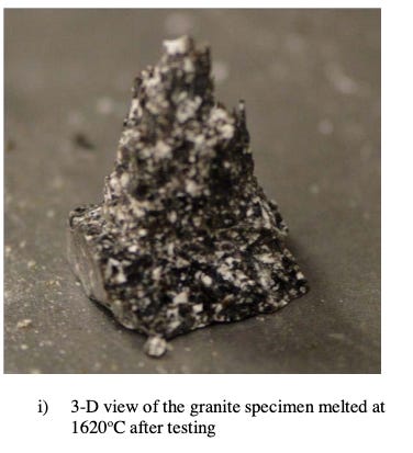 A few years ago, MIT researcher Dr. Paul Woskov, decided to try it to drill rocks. He reasoned that if Gyrotrons can indeed be so powerful, they should be able to vaporize and melt rocks without ever having to touch it. And just like that, the problem of wear and tear - the single biggest impediment in mechanical drilling is eliminated, and EGS can become reality. He brought commercially available gyrotrons and started zapping rocks in his laboratory, with interest from the US Dept. of Energy, which wanted to break into the SHR one way or the other. The entire scientific report is available here (and I enjoyed reading it way more than I expected!) I have selected some images of various types of rock that have been "drilled" through and obliterated without any contact, using high energy mmWave pulses: